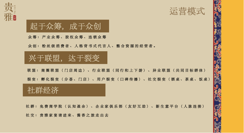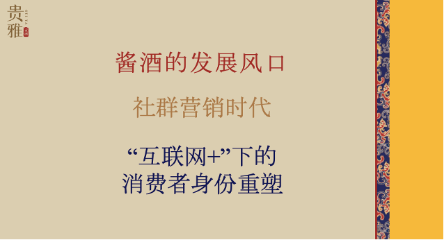 “白酒品牌的消费分为三个进化阶段:第一个阶段需要有酒喝,第二个阶段是要喝名酒,第三个阶段就叫价值化的消费市场”。通过文化结盟建立圈层,贵雅品牌把握了酱酒的风口时代,也抓住了互联网加持下的身份重塑时机。在运营层面,贵雅起于众筹,成于众创,兴于联盟,达于裂变,最终致力于冲破行业天花板以发掘分众市场的蓝海,收获全国的高端消费人群。