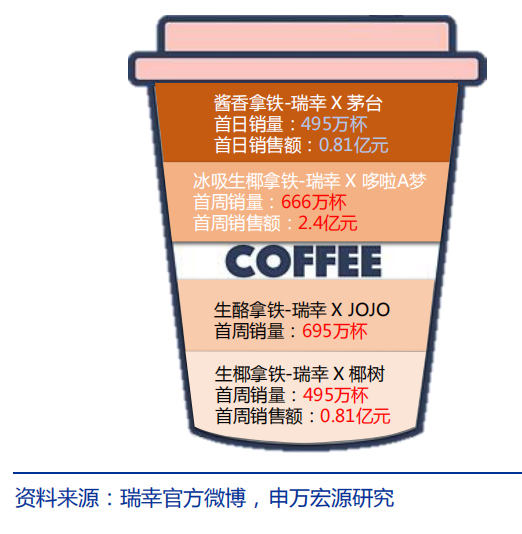 例如,根据瑞幸官方微博数据,瑞幸旗下4款经典联名商品首周销量均突破450万杯,并呈现逐渐提升趋势,其中酱香拿铁首日销量达542万杯,首日销售额突破1亿元,销售表现亮眼。联名商品的短期口碑和销售爆发体现了品牌基于内容价值点的产品创新能力以及强大的营销推广能力,随着联名产品的推陈出新有望不断贡献高业绩表现。